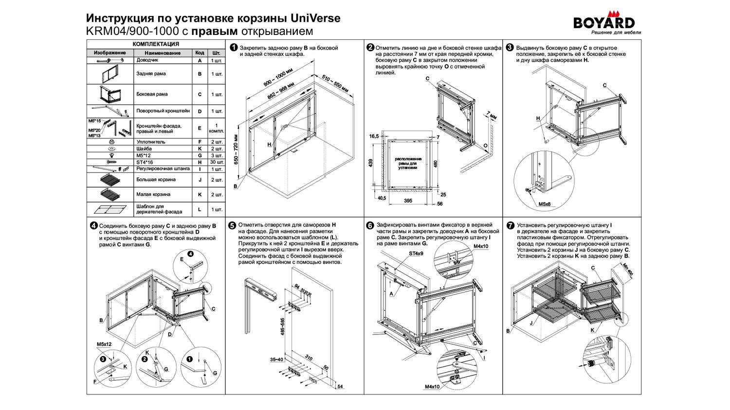 В комплекте с изделием поставляется специальный шаблон присадочных отверстий, который поможет точно определить место для крепления корзины. Шаблон является дополнением к основной инструкции и позволяет легко и быстро нанести разметку для установки сетчатого наполнения в базу кухонного гарнитура.