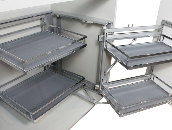 Универсальный «волшебный уголок» UNIVERSE KRM04 с поворотно-выкатным механизмом создан для рационального использования незадействованных угловых ниш и позволяет эргономично разместить множество предметов быта, включая посуду и технику.