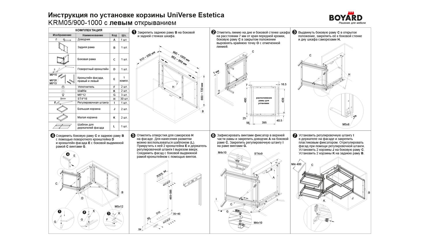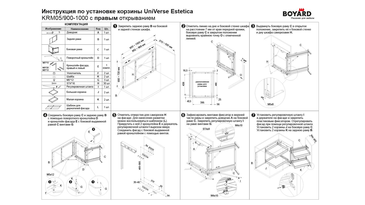 В комплекте с изделием поставляется специальный шаблон присадочных отверстий, который поможет точно определить место для крепления корзины. Шаблон является дополнением к основной инструкции и позволяет легко и быстро нанести разметку для установки сетчатого наполнения в базу кухонного гарнитура.