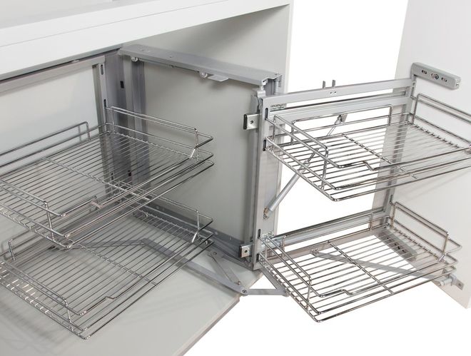 Поворотно-выкатной принцип выдвижения корзин обеспечивает легкий доступ в самые дальние уголки модуля, а два этажа корзин позволяют эргономично разместить множество предметов быта.