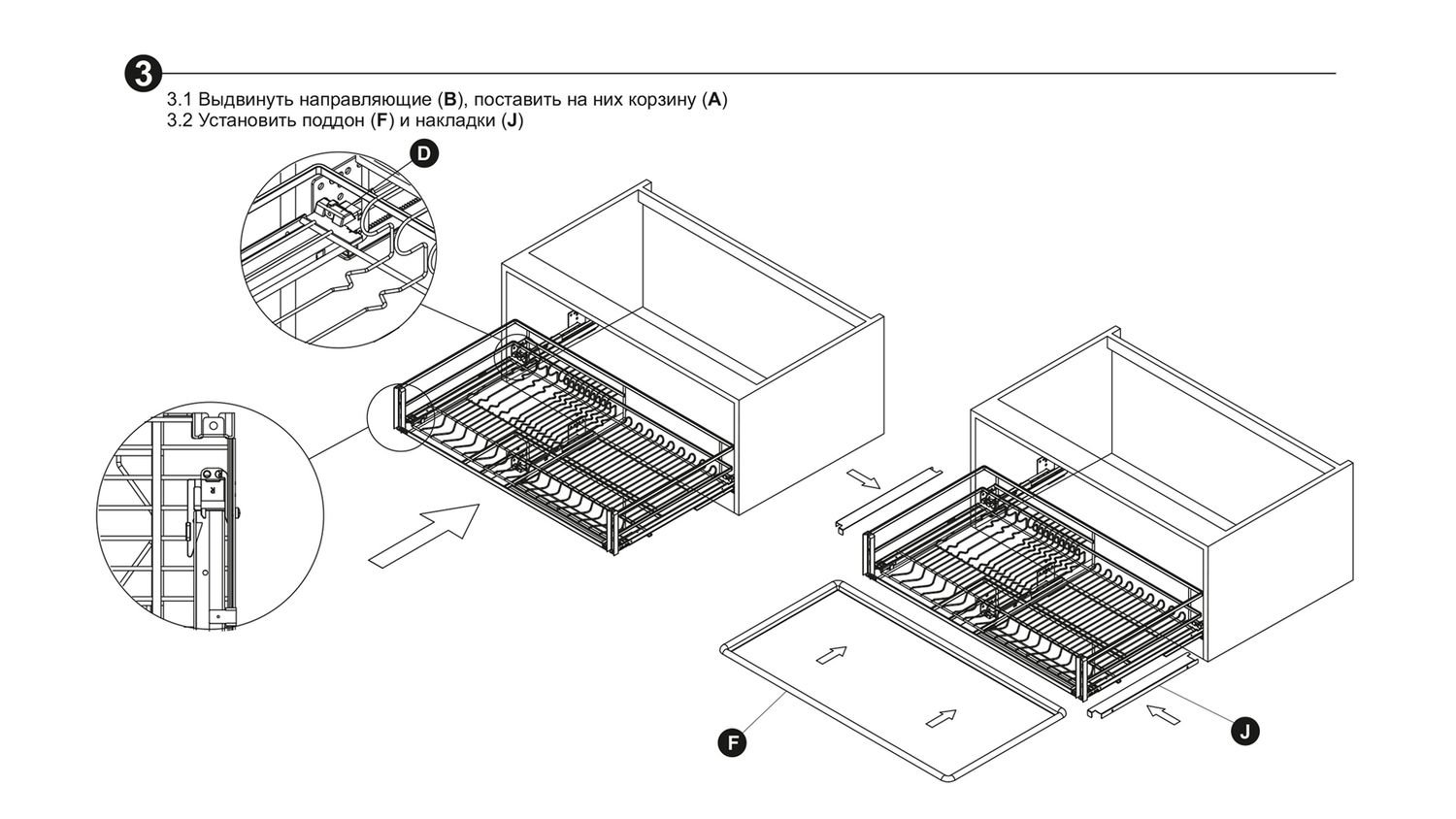 В комплекте с изделием поставляется специальный шаблон присадочных отверстий, который поможет точно определить место для крепления корзины. Шаблон является дополнением к основной инструкции и позволяет легко и быстро нанести разметку для установки сетчатого наполнения в базу кухонного гарнитура.