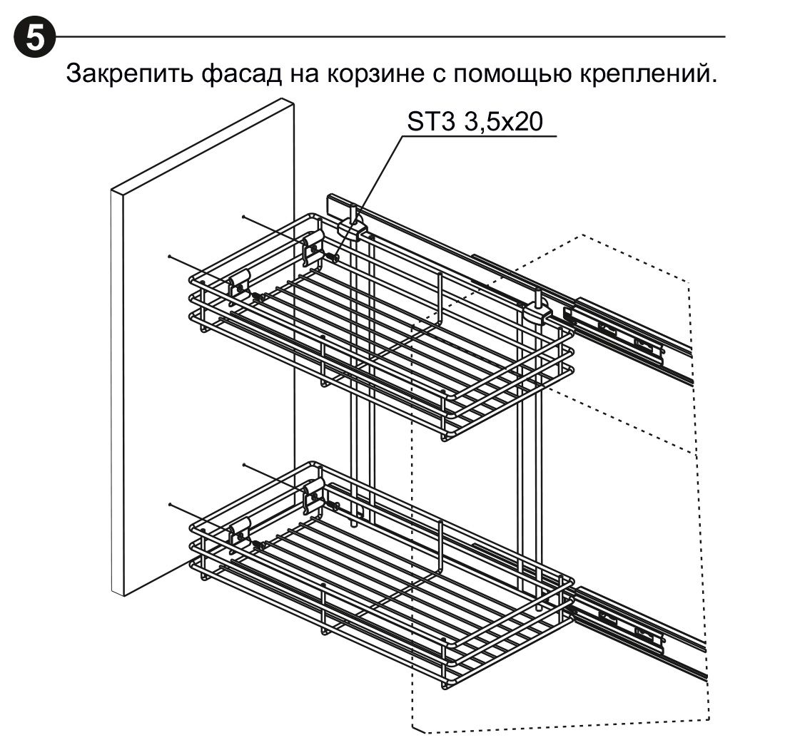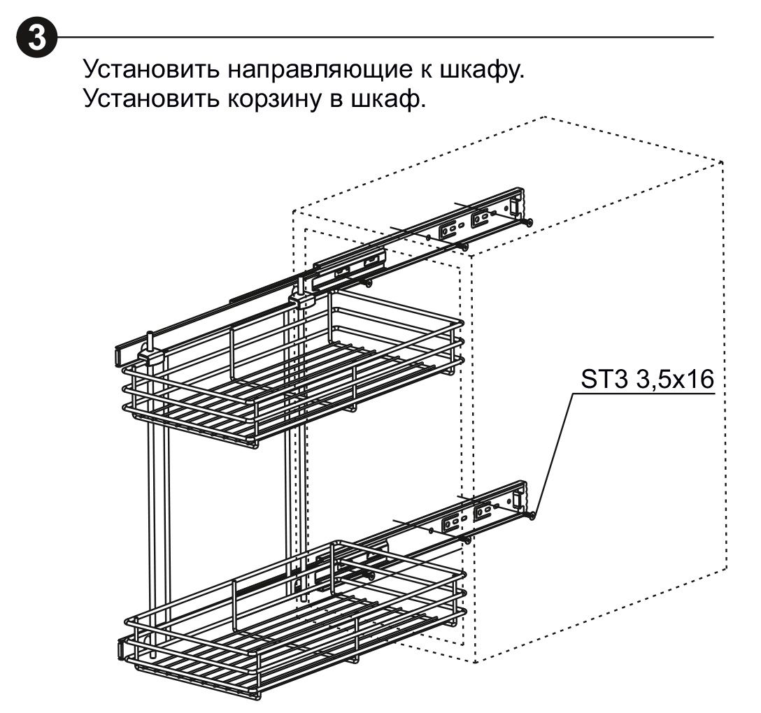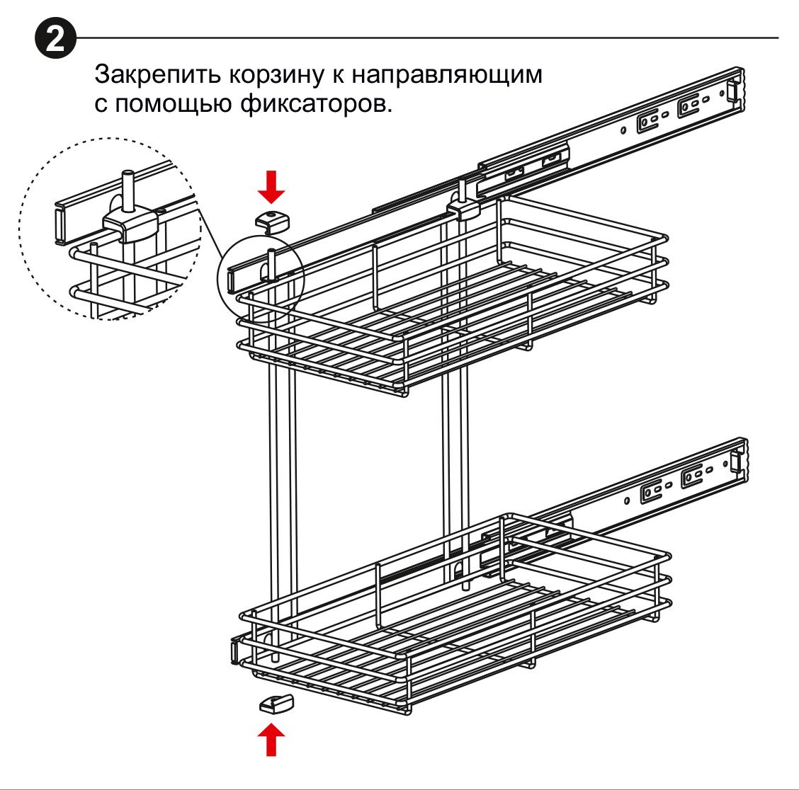 Вместительная выдвижная корзина предназначена для рациональной организации нижних модулей гарнитура в зоне хранения продуктов. «Первый этаж» двухуровневой системы имеет удобные ограничители – проволочные круги для упорядоченного и безопасного хранения банок, бутылок или сосудов, небольших кастрюль. Каждая банка, находясь на своем месте – в своей окружности, не упадет, не сместится, не разобьется.