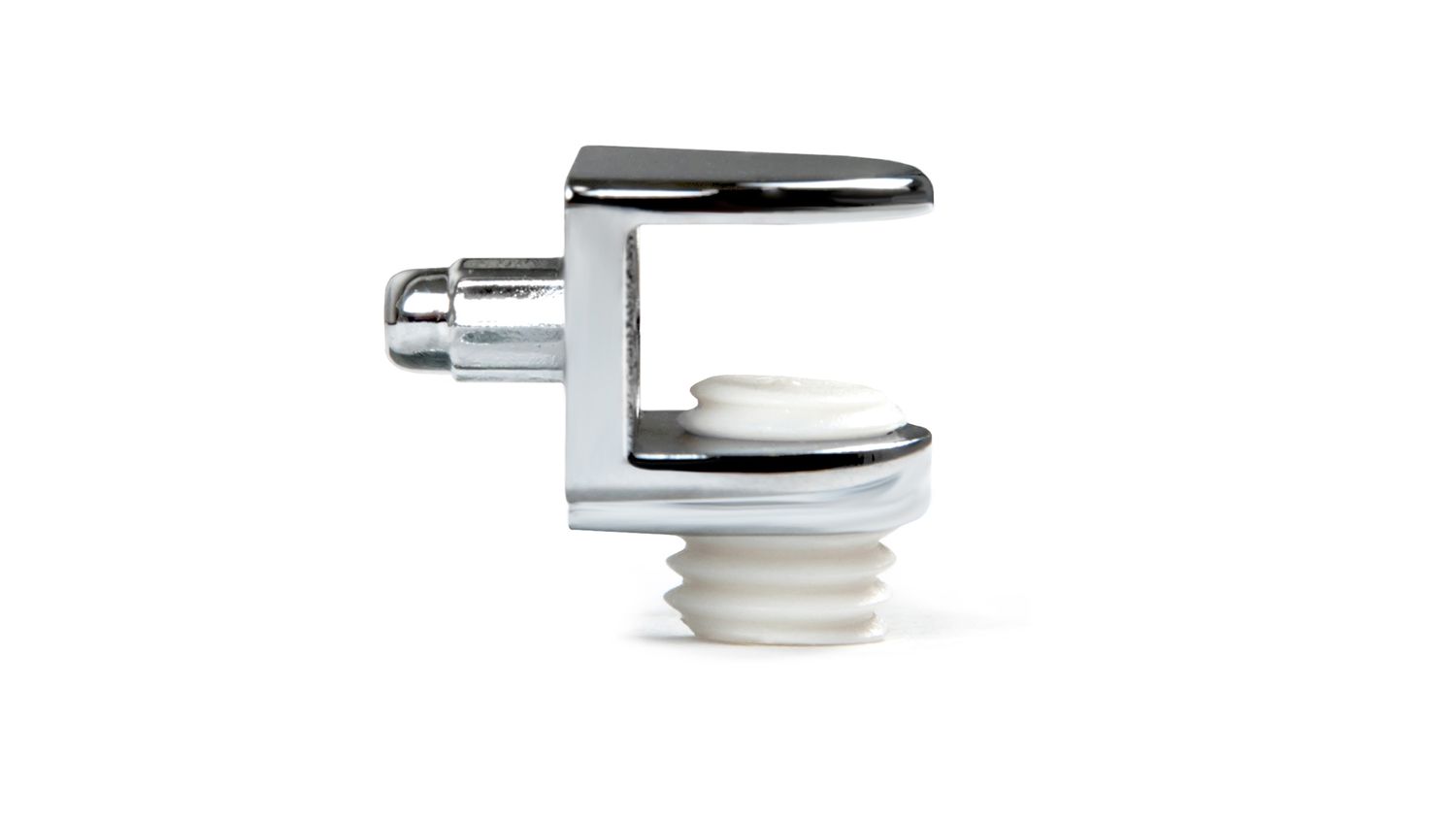 Металлический полкодержатель для стеклянных или тонких фанерных полок с опорой полочкой и регулируемым фиксатором теперь обладает модернизированной формой опорного штифта для большей функциональности и удобства