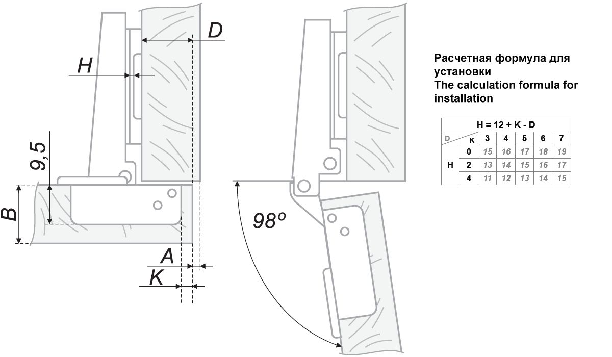 Способ монтажа петли:Под евровинт и саморез, с d отверстий 5,5 мм