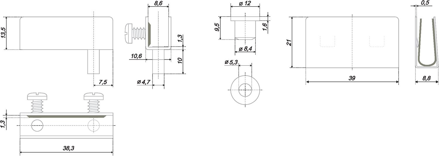 Петли для стекла HG001 толщиной до 6мм. Устанавливаются без сверления отверстия в стекле. Сверлятся не сквозные отверстия (d7х8мм) для втулок в верхней и нижней плоскостях шкафа. Затем в отверстия вставляют втулки, петли. Устанавливают стекло в петли, фиксируют его винтами, а к дверце крепят накладку. Рекомендуется использование совместно с магнитными держателями. Комплект предназначен для одного стеклянного фасада.