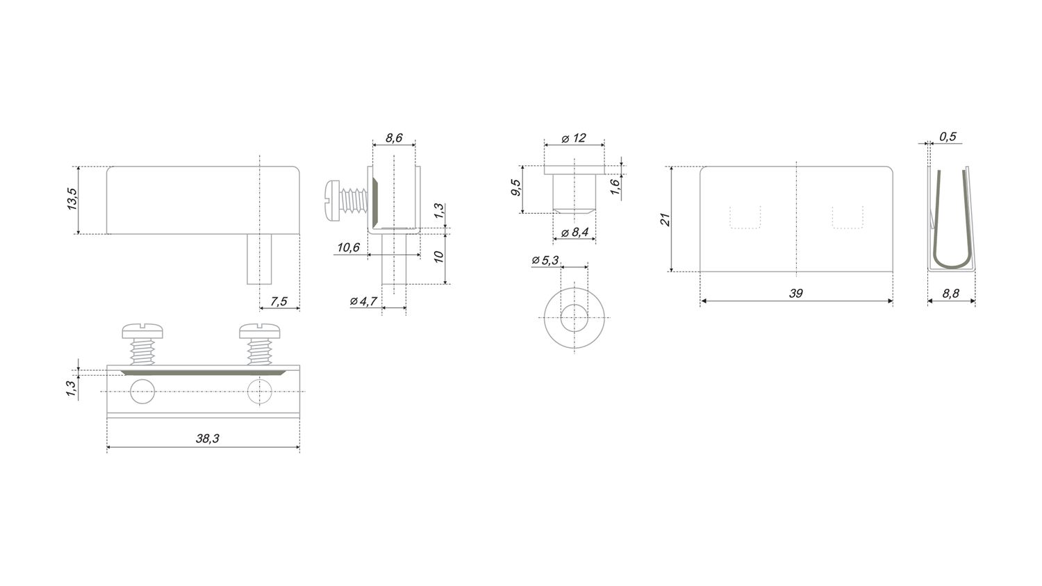 Петли для стекла HG001 толщиной до 6мм. Устанавливаются без сверления отверстия в стекле. Сверлятся не сквозные отверстия (d7х8мм) для втулок в верхней и нижней плоскостях шкафа. Затем в отверстия вставляют втулки, петли. Устанавливают стекло в петли, фиксируют его винтами, а  к дверце крепят накладку. Рекомендуется использование совместно с магнитными держателями. Комплект предназначен для одного стеклянного фасада.