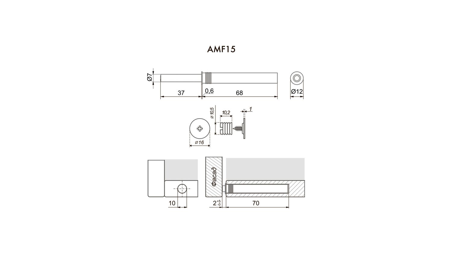 AMF15 – магнитный толкатель для врезного и накладного монтажа для установки на распашные фасады, фасады с открыванием вверх и фасады с открыванием вниз в рамках создания мебели с открытием от нажатия.