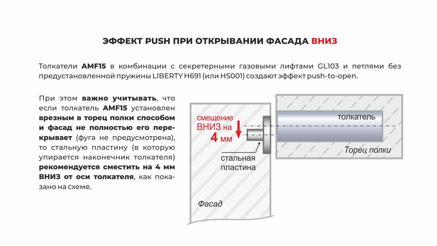 Для создания эффекта PUSH при открывании фасада вниз необходимо устанавливать толкатель AMF15 толкатель AMF15 с газовыми лифтами GL104 и петлями без пружины LIBERTY Н691 или HS001.