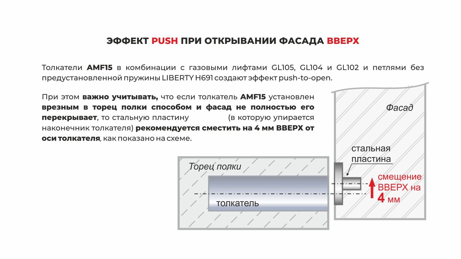 Для создания эффекта PUSH при открывании фасада вверх необходимо устанавливать толкатель AMF15 с газовыми лифтами GL102, GL104, GL105 и петлями без пружины LIBERTY Н691.