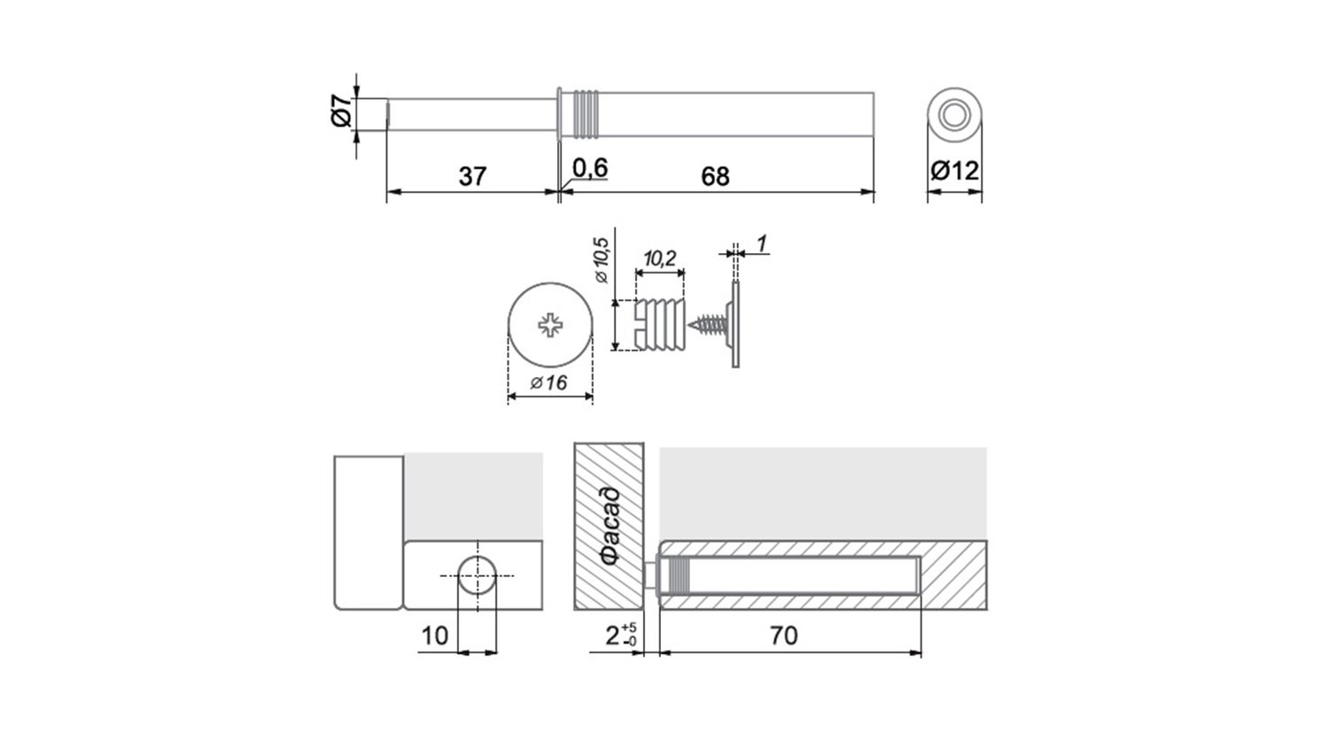Сильная пружина толкателя позволяет выталкивать даже тяжелые и крупные фасады минимум на 37 мм.