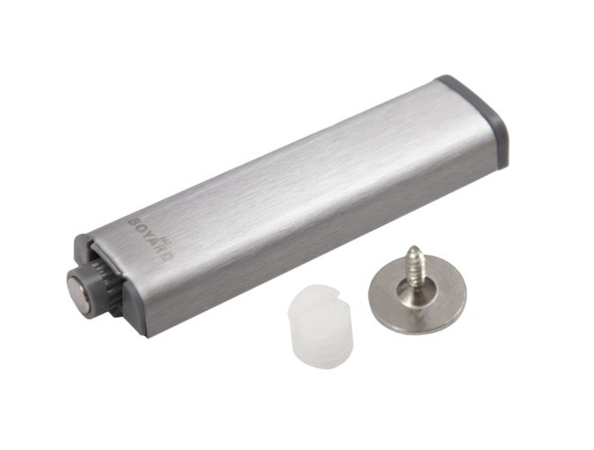 АМF12 - толкатель PUSH-TO-OPEN с корпусом из нержавеющей стали и линейной монтажной планкой для открывания и закрывания фасадов без мебельных ручек. Толкатель предназначен для современных шкафов с распашными фасадами и совместим с любым типом петель без амортизатора.