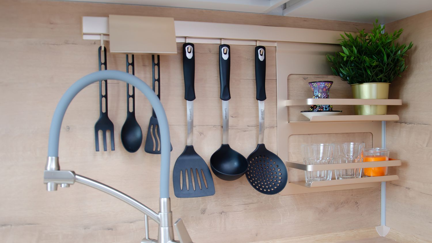 База-рейлинг для крепления полок – предмет, с которого начинается вся система аксессуаров B-Planum. Он обладает универсальной длинной 800 мм, в зависимости «широты» дизайнерского решения кухни можно установить один рейлинг или несколько. Плоские современные формы BASE выполнены в двух стильных оттенках – «Шампанское» для классических интерьеров и «Тефлон» для кухонь, в стиле минимализм. База занимает минимум пространства и легко умещает на себе разнообразные полки, крючки и корзины.