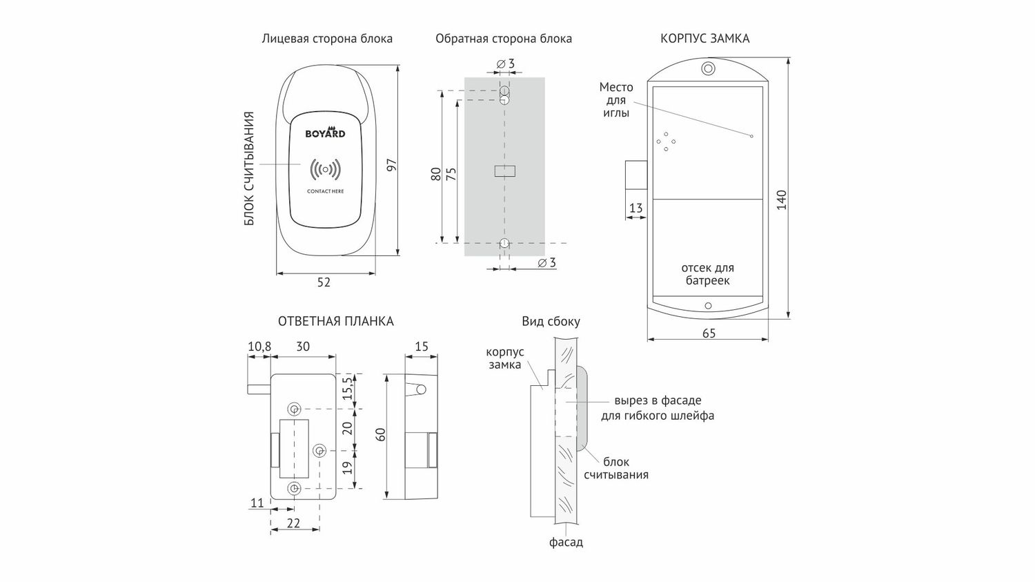Продуманный корпус устройства состоит из блока считывания, который монтируется с лицевой стороны фасада, и с помощью гибкого шлейфа соединяется с корпусом замка (для этого в фасаде необходимо сделать вырез). Для открывания фасада используется браслет.