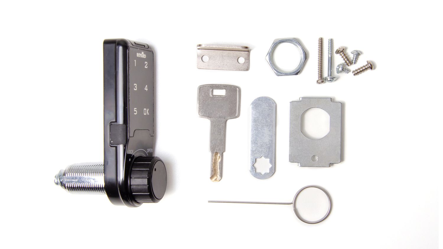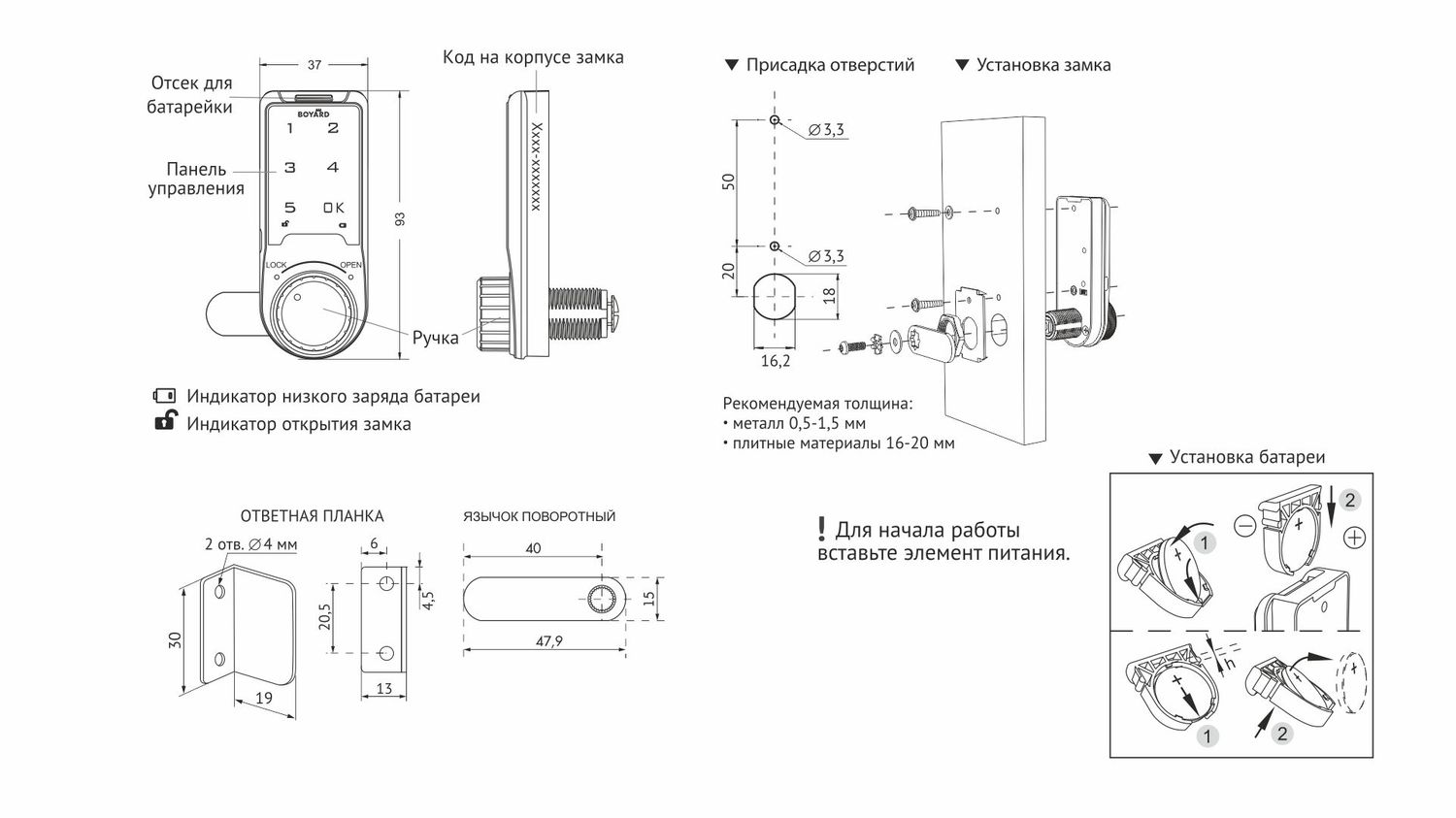 Замок состоит из сенсорной клавиатуры на лицевой части фасада, а также поворотного механизма с обратной стороны фасада, который открывает / блокирует его в зависимости от набранного кода. Для установки замка потребуется просверлить сквозное отверстие в фасаде.