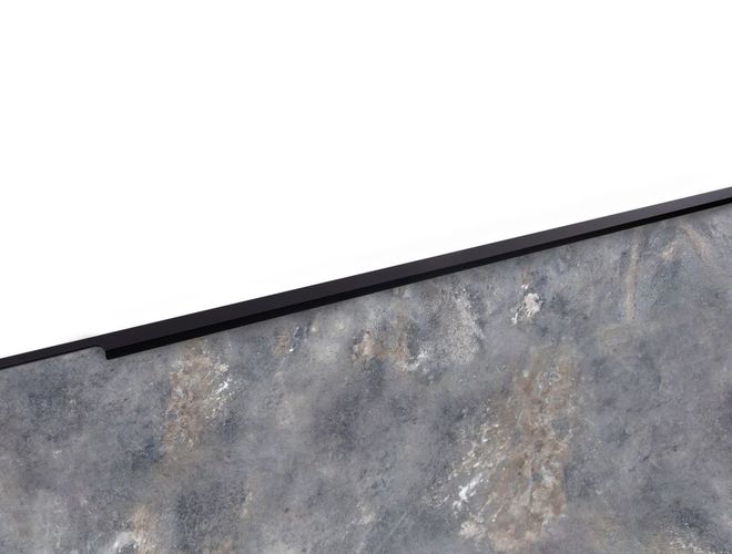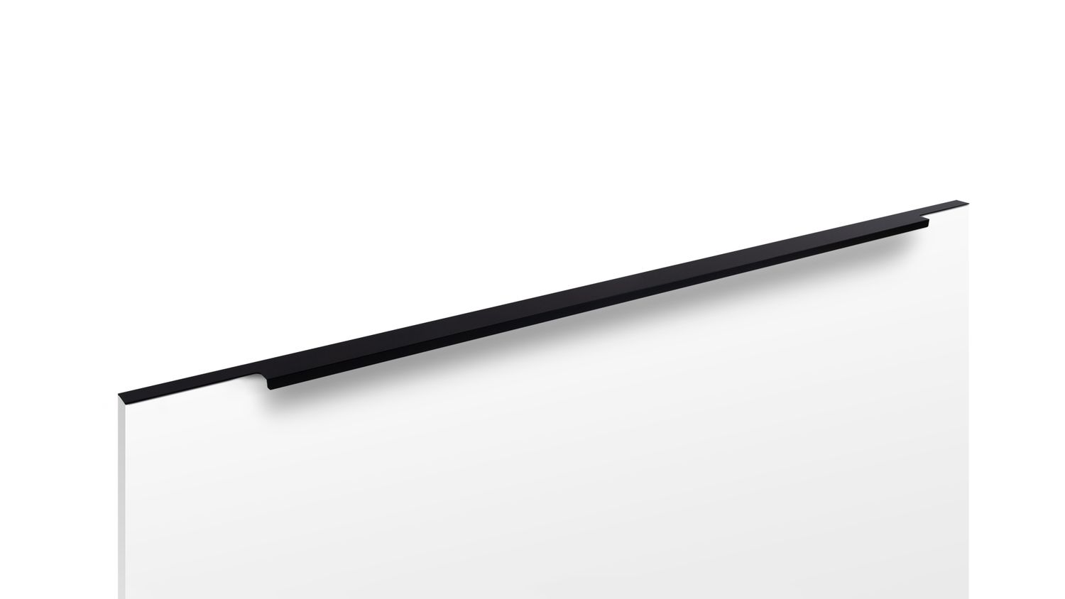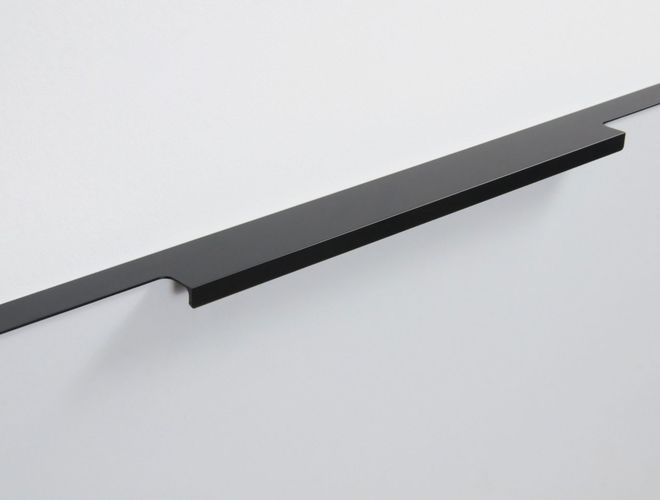 Ручка имеет богатую палитру цветовых решений и разнообразие длин. Данная модель допускает размещение двумя способами — «в размер» фасада и по центру широких фасадов (как большой «язычок»).