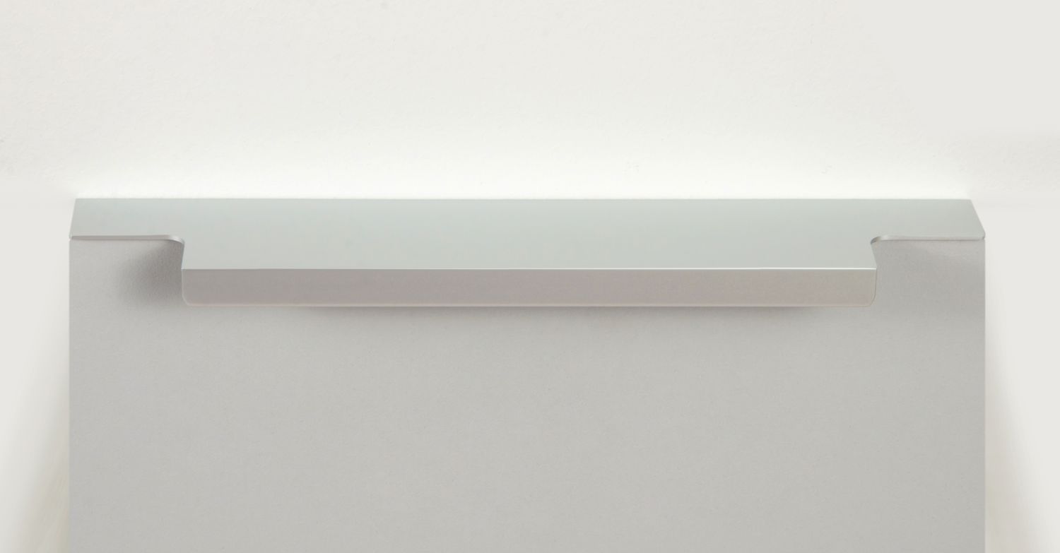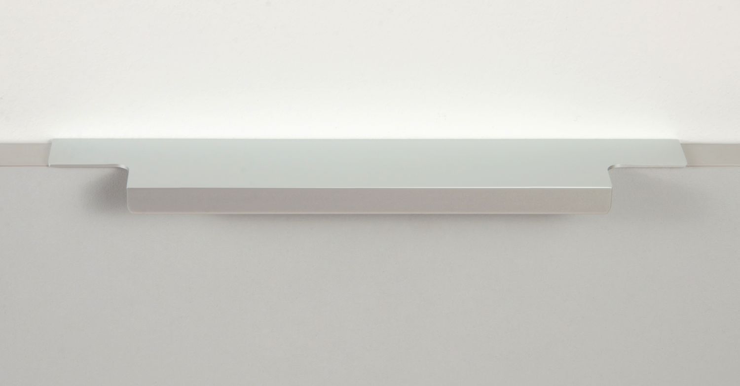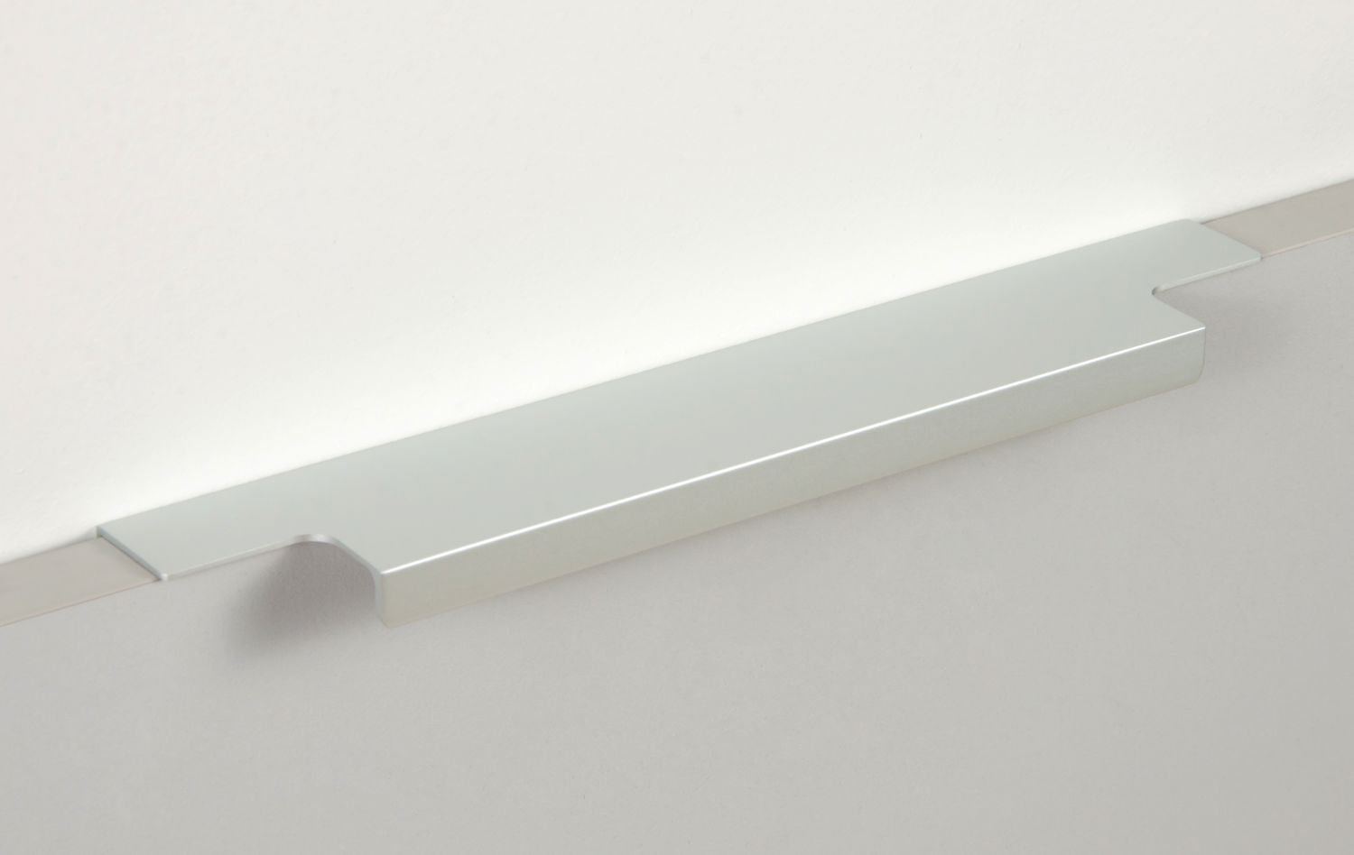Ручка имеет богатую палитру цветовых решений и разнообразие длин. Данная модель допускает размещение двумя способами — «в размер» фасада и по центру широких фасадов (как большой «язычок»).