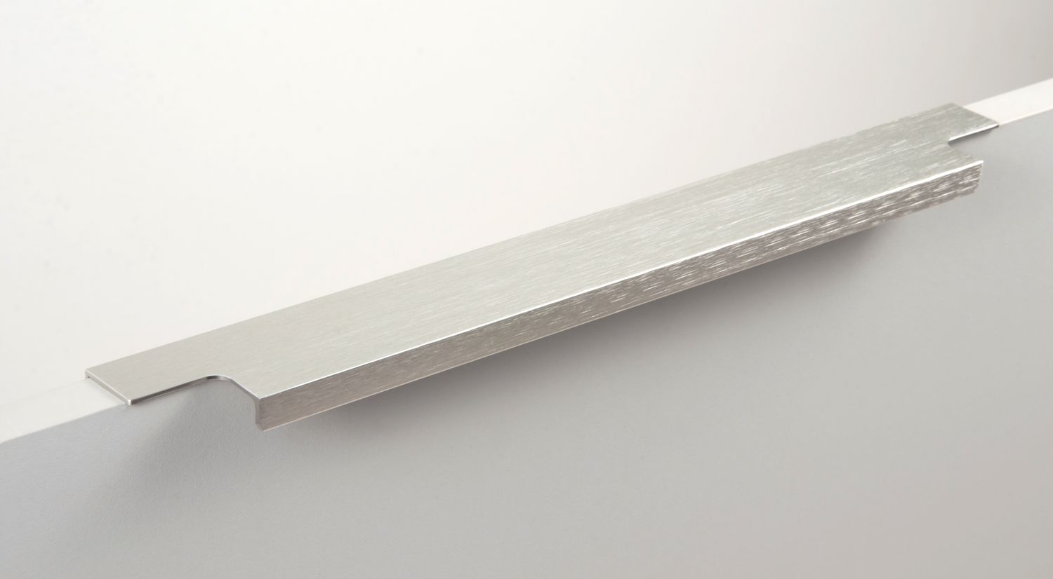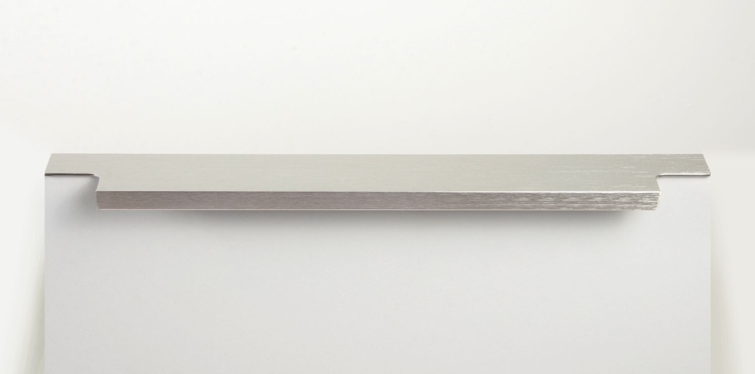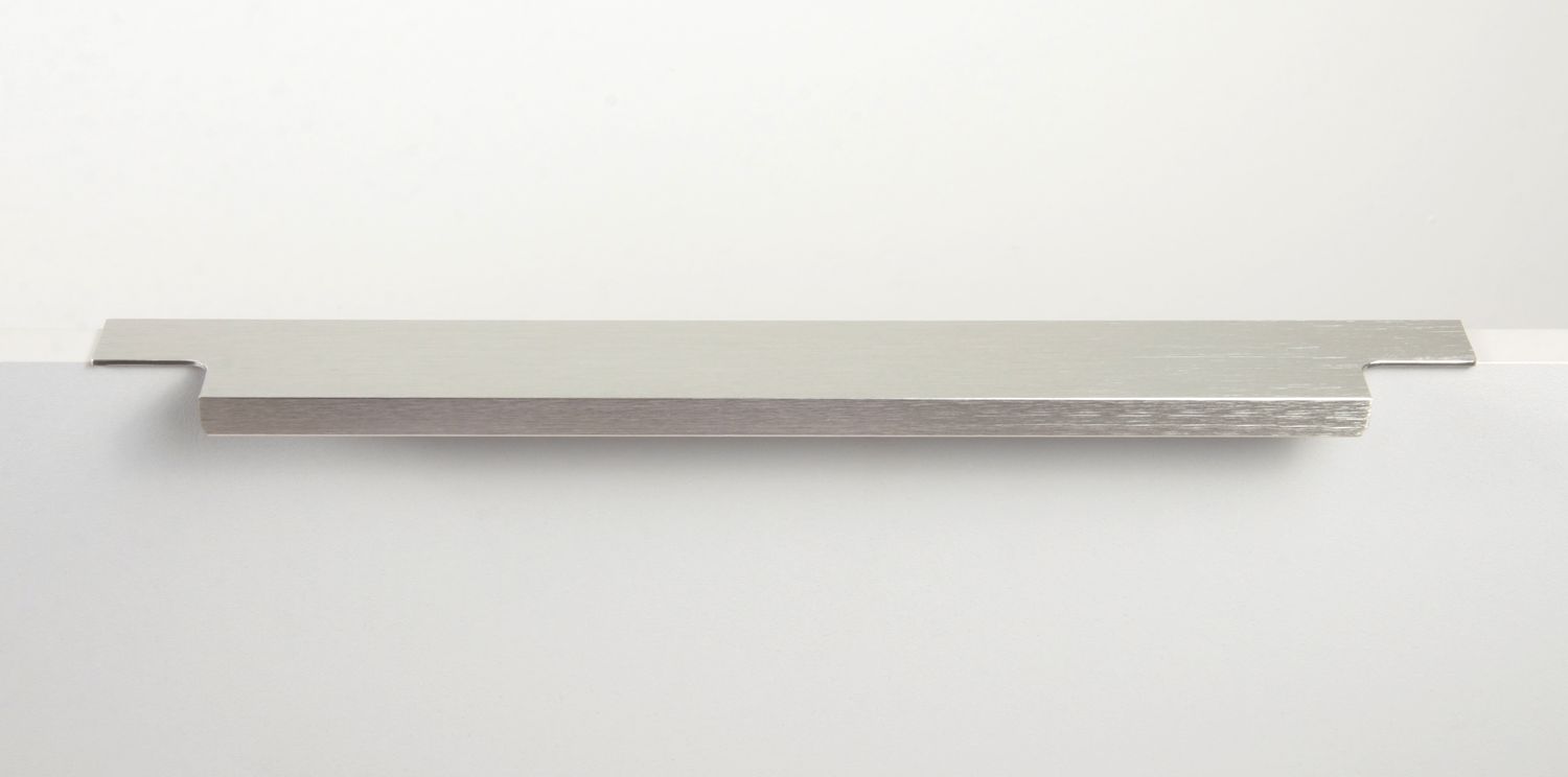 Ручка имеет богатую палитру цветовых решений и разнообразие длин. Данная модель допускает размещение двумя способами — «в размер» фасада и по центру широких фасадов (как большой «язычок»).