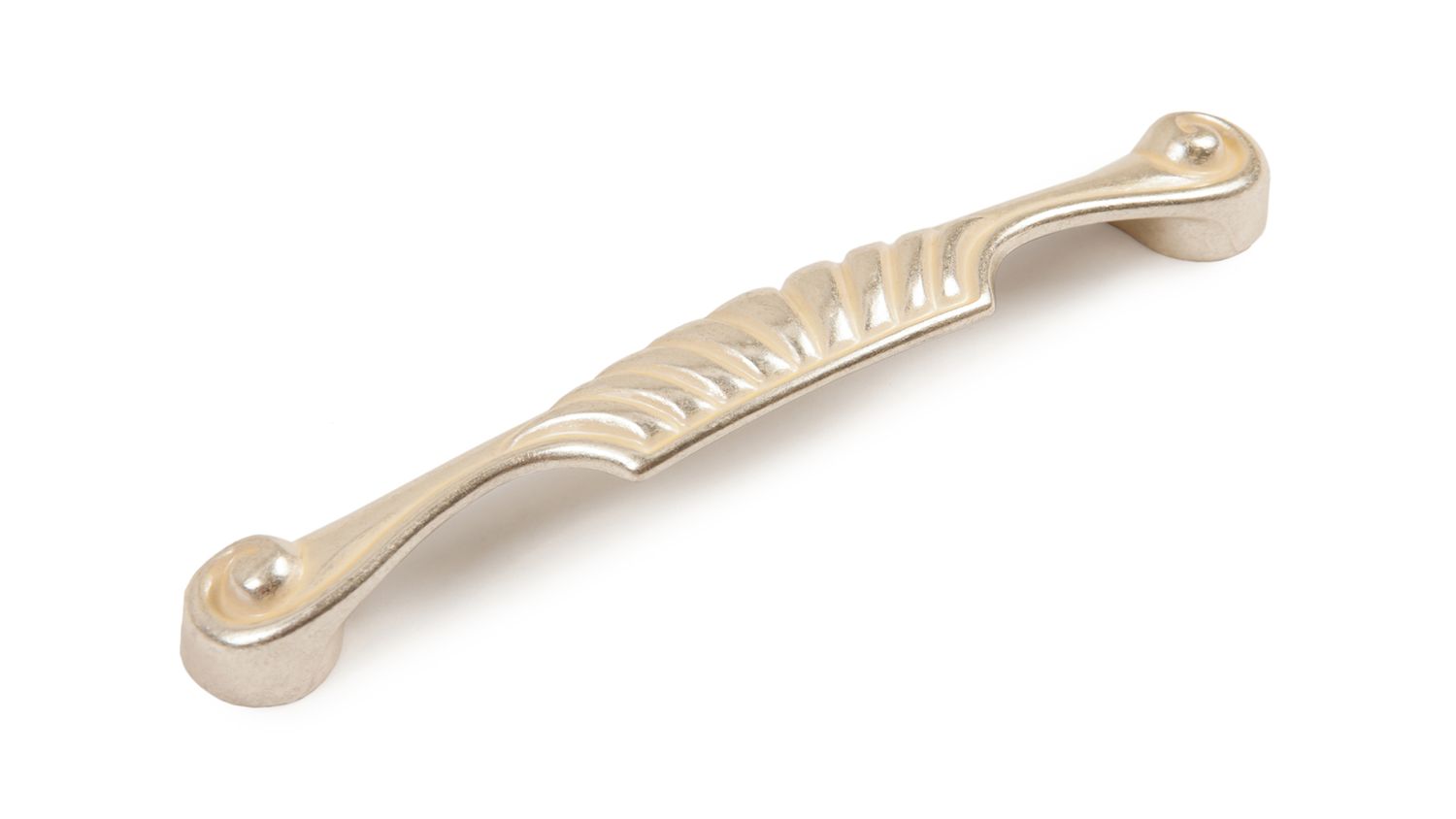 Ручка будет гармонично смотреться на классическом фасаде с ажурной фрезеровкой. Палитра покрытий ручки  – старинное серебро и нежный белый в золотой и серебряной патине – прекрасно подойдёт под фасады натуральных древесных оттенков от тёплого коричневого до светлого ореха.