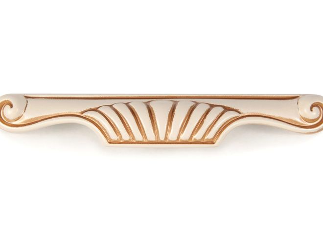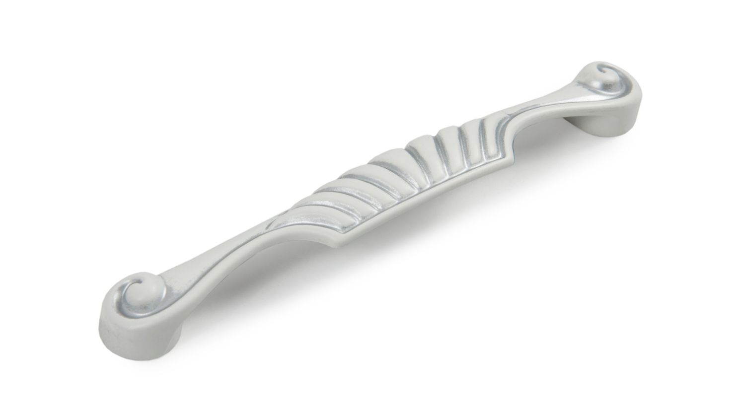 Ручка будет гармонично смотреться на классическом фасаде с ажурной фрезеровкой. Палитра покрытий ручки  – старинное серебро и нежный белый в золотой и серебряной патине – прекрасно подойдёт под фасады натуральных древесных оттенков от тёплого коричневого до светлого ореха.