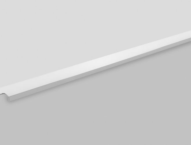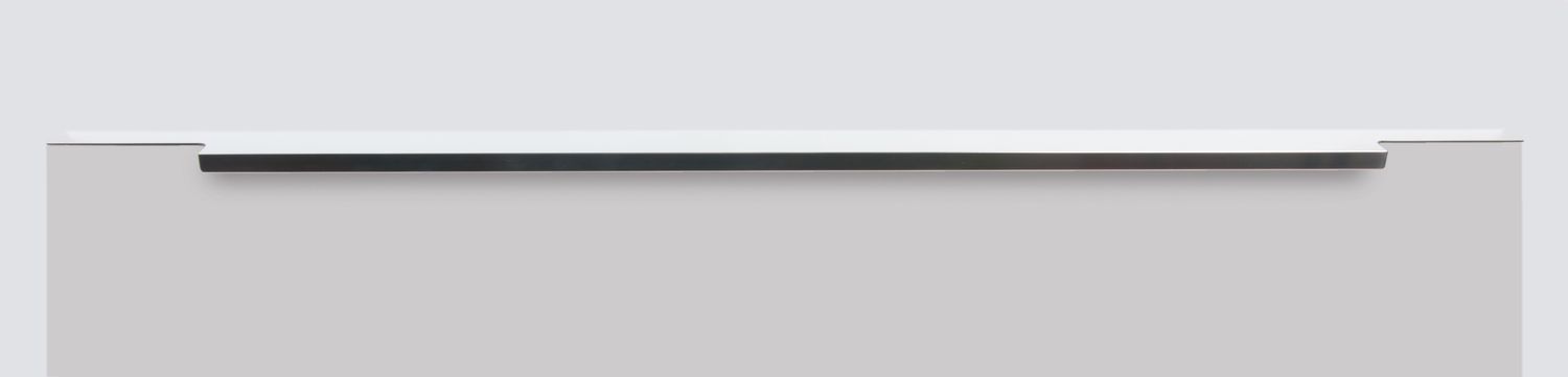 Ручка имеет богатую палитру цветовых решений и разнообразие длин. Данная модель допускает размещение двумя способами — «в размер» фасада и по центру широких фасадов (как большой «язычок»).