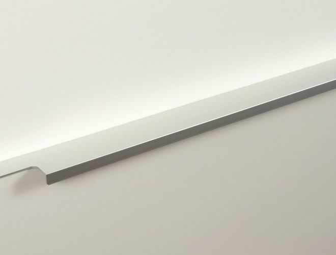 Ручка имеет богатую палитру цветовых решений и разнообразие длин. Данная модель допускает размещение двумя способами — «в размер» фасада и по центру широких фасадов (как большой «язычок»).