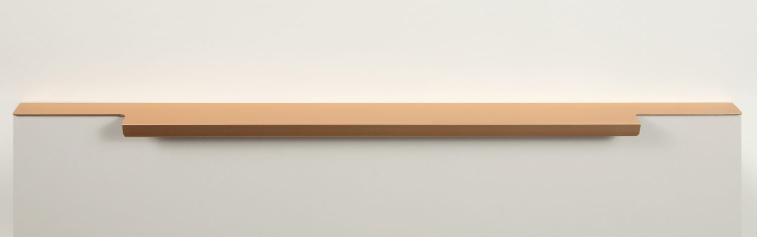 Ручка имеет богатую палитру цветовых решений и разнообразие длин. Данная модель допускает размещение двумя способами — «в размер» фасада и по центру широких фасадов (как большой «язычок»).