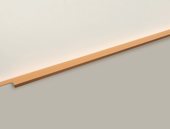 Ручка имеет богатую палитру цветовых решений и разнообразие длин. Данная модель допускает размещение двумя способами — «в размер» фасада и по центру широких фасадов (как большой «язычок»).