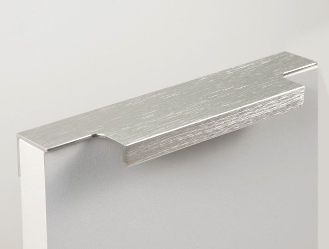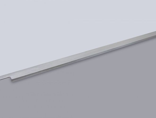 Ручка имеет богатую палитру цветовых решений и разнообразие длин. Данная модель допускает размещение двумя способами — «в размер» фасада и по центру широких фасадов (как большой «язычок»).
