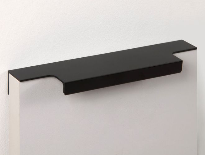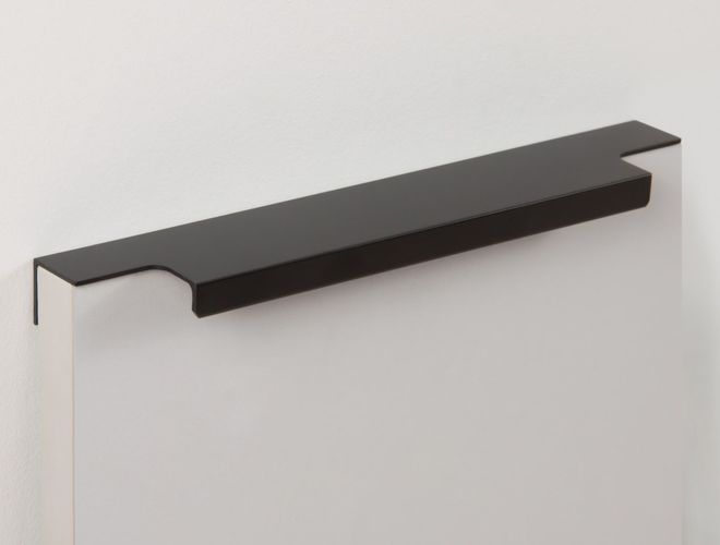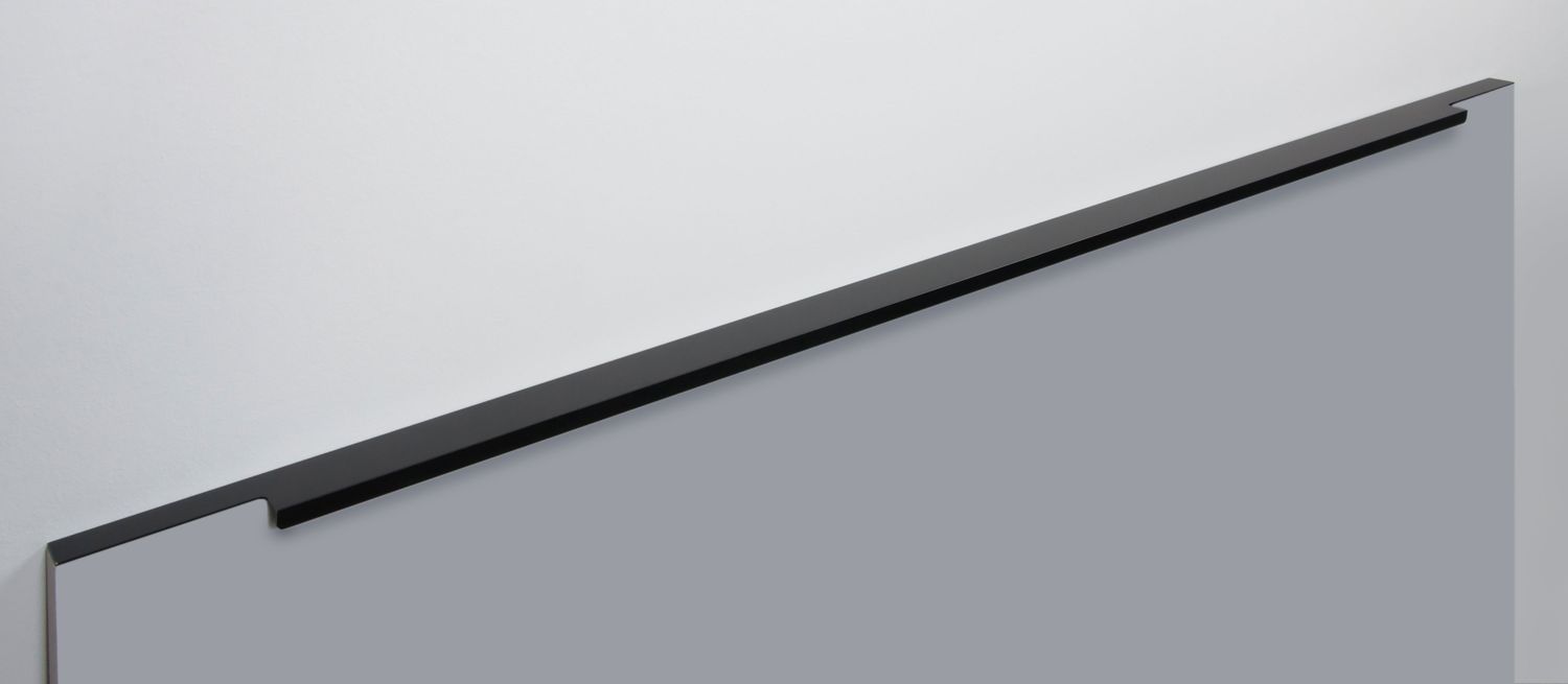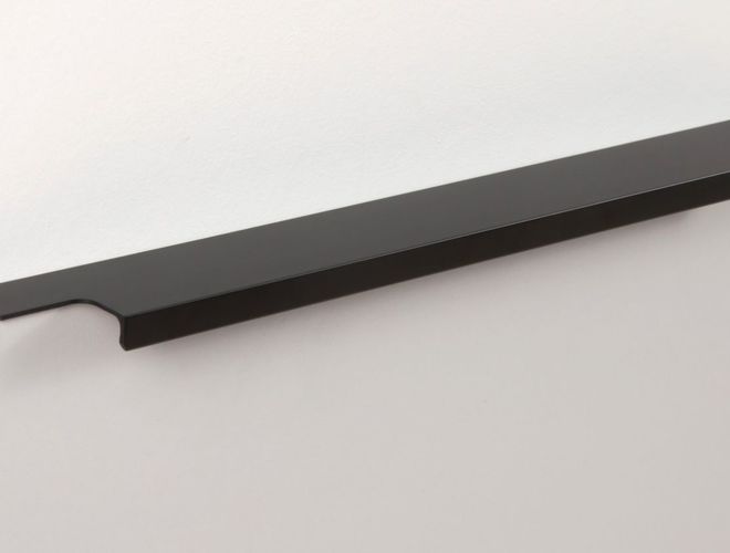 Ручка имеет богатую палитру цветовых решений и разнообразие длин. Данная модель допускает размещение двумя способами — «в размер» фасада и по центру широких фасадов (как большой «язычок»).