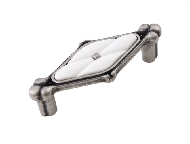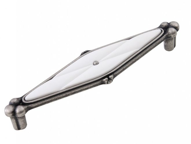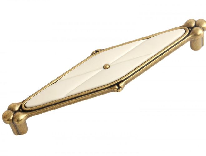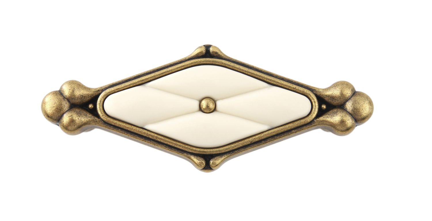 Модель DIVA RS118 –  утонченная ручка, созданная по всем канонам стиля Romantica. Изящный ромб с округлыми контурами, нежная вставка молочного оттенка и искусное покрытие, имитирующее состаренный металл - всё это навевает мысли об очаровании антикварной мебели.