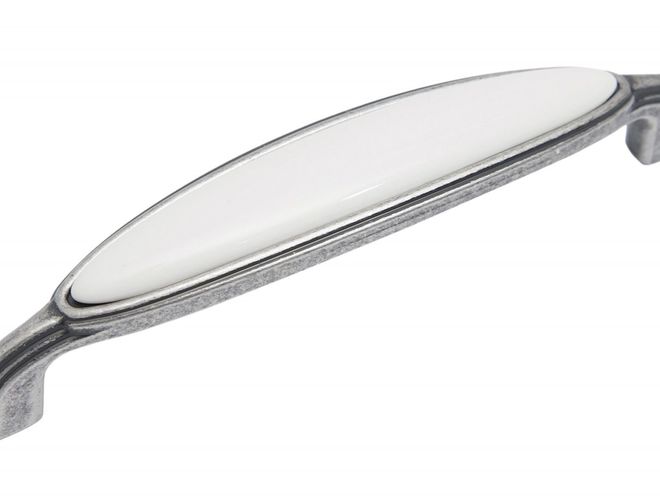 Ручка-скоба CHLOE RS124 – нежная и утонченная модель в эстетике стилей vintage и romantica. Сочетание металла в покрытии “Черненый старинный цинк” с белой керамической вставкой смотрится гармонично и благородно. Завершенная овальная форма и лаконичный дизайн понравится ценителям классики и ретро-эстетики в интерьере, оформленном в холодных оттенках дерева – от светлых до более насыщенных. Модель универсальна: может стать деликатным дополнением мебели для кухонь, спален и гостиных комнат.