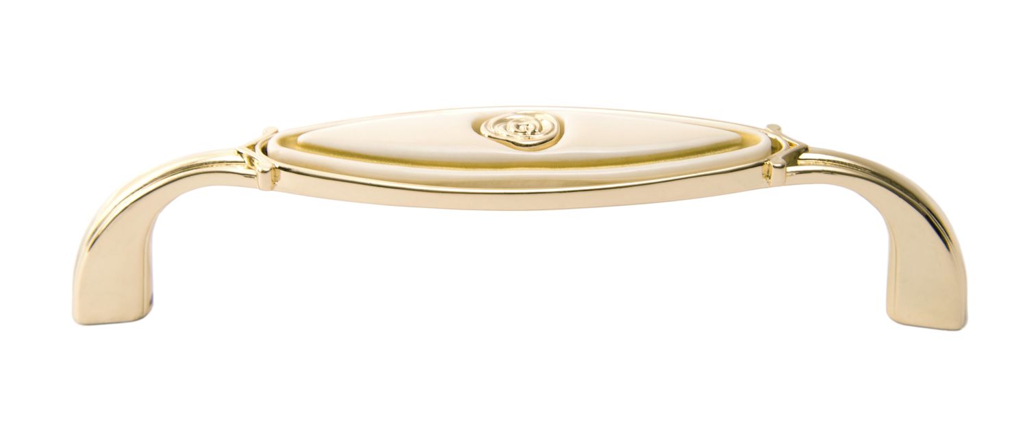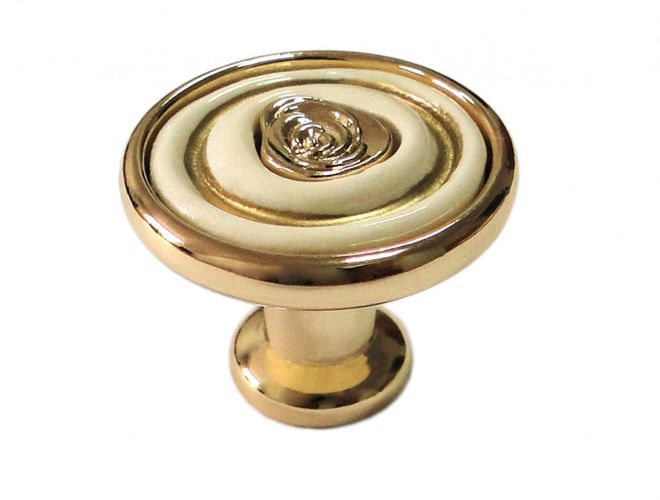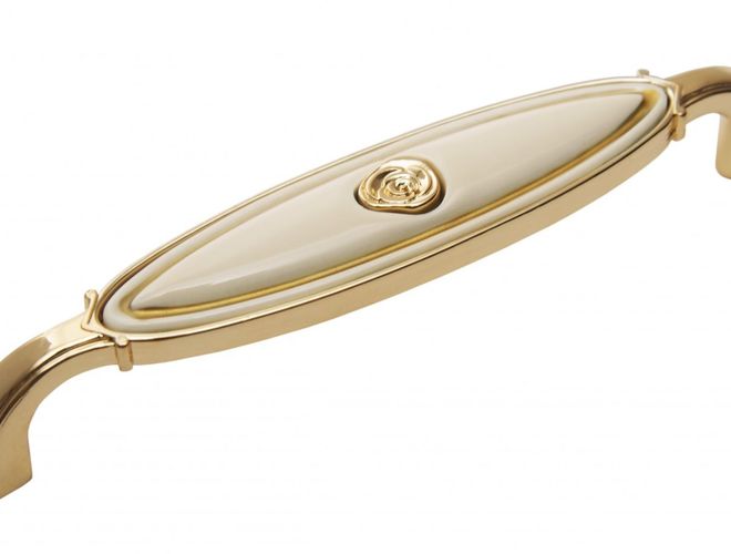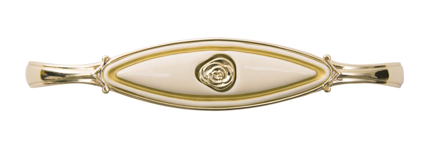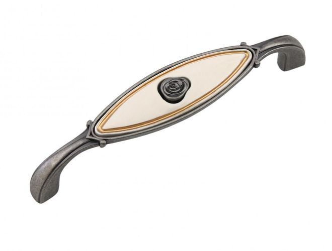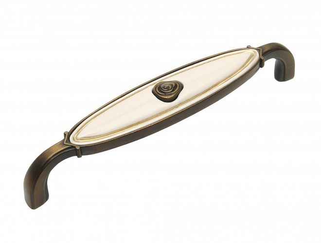 С металлом в состаренных покрытиях сочетается керамическая вставка, украшенная розой. Ручка напоминает произведение искусства – старинную камею, изящное изделие для украшения интерьера. Это не просто ручки для открывания фасада – это детали декора, создающего облик мебели.