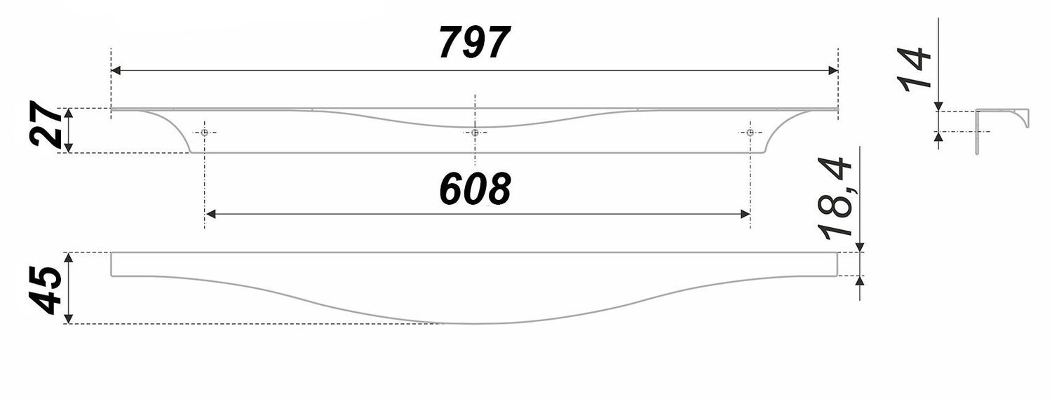 Ширина фасадов 400, 450, 500, 600, 800 – самые распространенные в массовом секторе мебели. Именно с такими параметрами предложены торцевые ручки M «в размер» фасада.