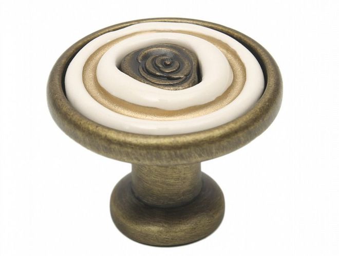 С металлом в состаренных покрытиях сочетается керамическая вставка, украшенная розой. Ручка напоминает произведение искусства – старинную камею, изящное изделие для украшения интерьера. Это не просто ручки для открывания фасада – это детали декора, создающего облик мебели.