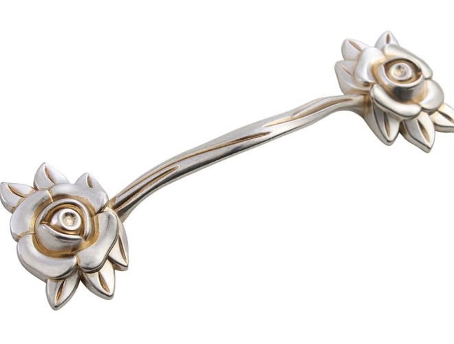 Ручка-кнопка RC087 представляет собой розу, выполненную в цвете старинное серебро с акцентами сатинового золота. Компактная, ручка-роза в то же время соответствует духу изящного великолепия и может стать выражением особенного взгляда на жизнь – эстетически требовательного, стремящегося к совершенству и к завершенности стилевого выражения.