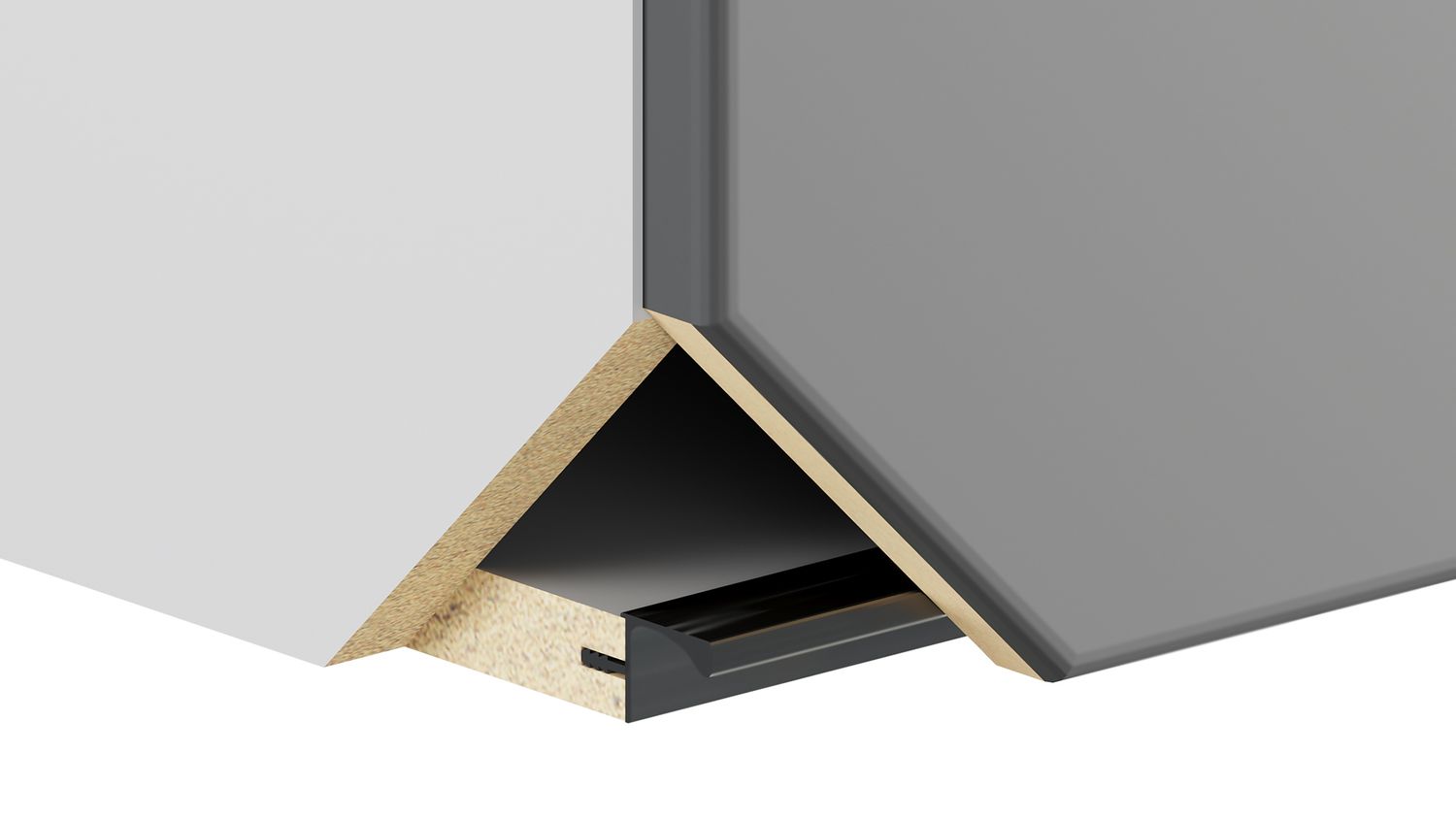 RP052 — профиль GOLA BALANCE для верхних баз мебельного гарнитура. Для установки ручки-профиля необходимо профрезеровать торец дна навесных модулей. Установленная ручка создаёт выемку для удобного захвата и открывания фасада рукой.
