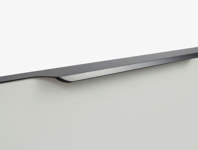 TERA подойдёт как для узких бутылочниц и корзин-карго, так и ящиков формата макси. Торцевую ручку, независимо от размера, можно устанавливать не только чётко в размер фасада, но и как широкий язычок. Ручки в виде язычков прекрасно выполняют свою функциональную и эстетическую роль на более широких фасадах.