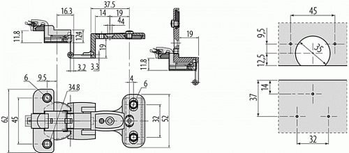 Петля угловая GTV 270 градусов с клипом, без евро, для плиты 18мм - механизм для деревянных фасадов с широким углом открывания. По способу установки это накладная петля, специально для ДСП и МДФ толщиной 18 мм.