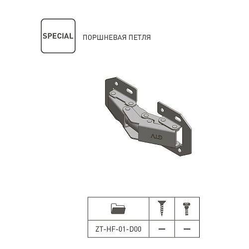 Петля поршневая быстрого монтажа GTV ZT-HF-01-D00, большая - механизм накладного типа для деревянных фасадов. Ключевая особенность петли; для ее установки не требуется фрезеровка (сверление отверстия под чашку, как у стандартных петель).