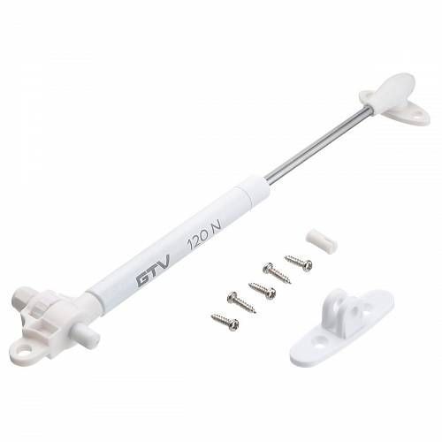 Подъёмник газовый с амортизатором 120N GTV, белый - мебельный подъемник, в конструкции которого предусмотрены доводчик и амортизатор. При правильной регулировке газлифта, в момент закрывании фасада исключается удар и сопутствующий ему шум.