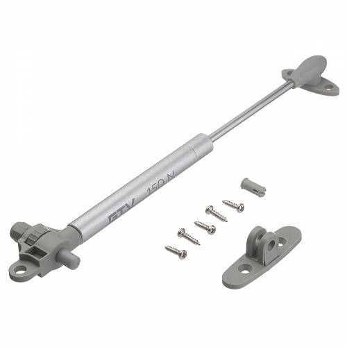 Подъёмник газовый с амортизатором 150N GTV, серый - мебельный подъемник, в конструкции которого предусмотрены доводчик и амортизатор. При правильной регулировке газлифта, в момент закрывании фасада исключается удар и сопутствующий ему шум.