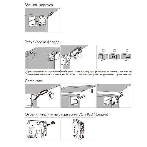 Регулировка фасада по ширине, высоте и глубине (с помощью предустановленных регулировочных винтов на каждом из подъемников).