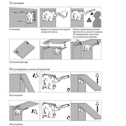 Регулировка фасада по ширине, высоте и глубине (с помощью предустановленных регулировочных винтов на каждом из подъемников).
