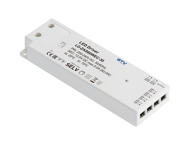 Блок питания SLIM EASY CLICK 12V,60W, input 220-240VAC, IP20, разм.190x62x21мм, с mini amp и проводо - LD-ZAS60WEC-30