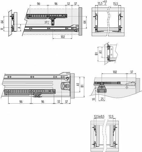 Метабоксы и роликовые направляющие приобретаются отдельно, в соответствии с параметрами, указанными производителем (глубина ящика - от 350 мм до 550 мм).