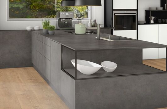 В цветовой гамме декора Бетон Чикаго тёмно-серый присутствует множество тёплых оттенков, и поэтому он лучше подходит для создания гармоничных комбинаций с древесными репродукциями белых или также натуральных оттенков