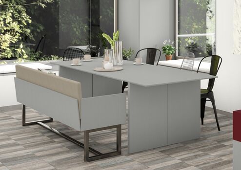 Алюминий мелкоматированный – это декор бумажно-слоистого пластика с имитацией тонкошлифованного металла. По сравнению с классической репродукцией алюминия он демонстрирует тонкие следы шлифовки и смотрится несколько темнее и изысканнее, особенно в сочетании с древесными декорами тёплых оттенков или тонами цвета тауп.