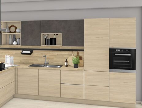 В цвете шампань декор имеет элегантный современный оттенок бежевого с небольшой долей серого, позволяющего создавать современные комбинации с однотонными декорами и репродукциями материалов серого оттенка.
