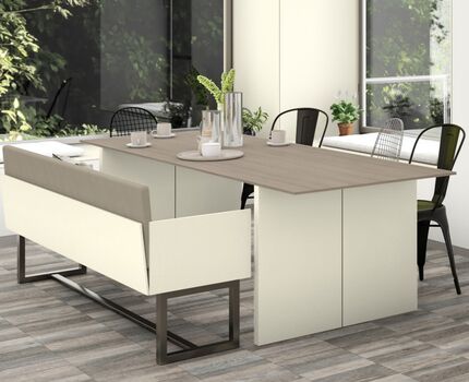 Декор Алебастр белый имеет достаточно сильно выраженный желтоватый характер, отчего граничит с кремовыми оттенками. Здесь возможны тёплые сочетания с более классическими древесными декорами.