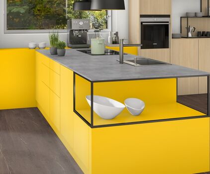 Холодный Цитрусовый жёлтый может стать модным акцентом в сочетании с чисто белыми, холодными серыми однотонными декорами или репродукциями материалов, таких как бетон. С натуральными древесными декорами он создаёт эффект прохлады и свежести. Во внутренней отделке этот декор часто применяется в качестве яркого сигнального цвета.